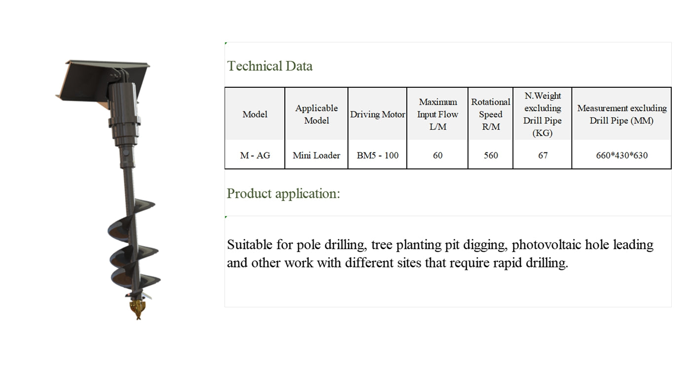 The M-AG hydraulic auger is a versatile attachment designed for all mini skid steer models. Built for efficient drilling, it provides the power and reliability needed for installing posts, planting trees, and completing soil excavation tasks with ease. Compact and durable, it's a must-have tool for construction, landscaping, and agricultural projects.